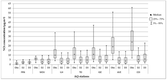Figure 6 shows the median and some percentiles calculated for the hourly observed and modelled NO2 concentrations at these monitoring sites. Good agreement between observations and estimates was obtained in background rural stations (FRN, MOV), since these are normally located on quite homogeneous areas with limited and well-identified emission sources, which favours the numerical resolution of all processes occurring within the atmospheric boundary layer. In turn, as expected, highest measured values were recorded in traffic stations (AVE, COI), due to the intense road activity and its significant contribution to urban NO2 pollution.