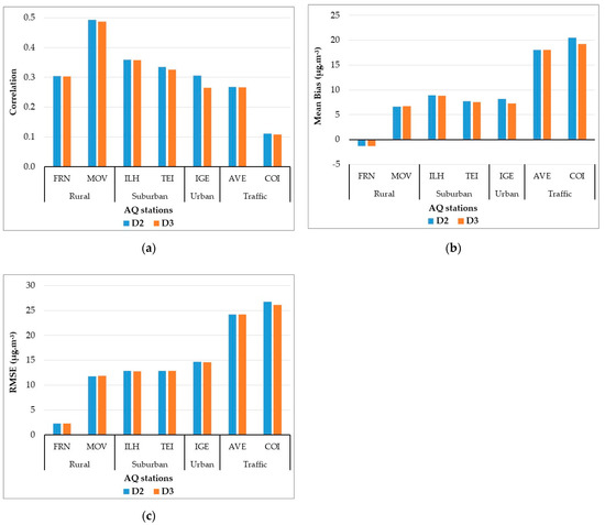 (a) Correlation, (b) mean bias, and (c) RMSE between the NO2 observations from Portuguese air quality monitoring stations and the modelled concentrations (µg·m−3) for domains D2 and D3.