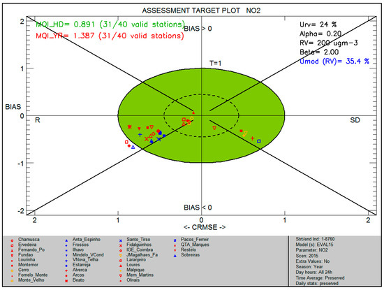 Statistics for the Portuguese background stations with more than 75% of data availability (31 out of 40) were produced, considering hourly series of modelled (D2) and observed NO2 concentrations. Instead of the mean bias and RMSE, the Delta Tool works with normalised BIAS and centred RMSE (see Appendix A for the equations). For the valid stations, an acceptable quality level based on hourly modelled values was obtained (MQI_HD of 0.891), but it failed when annual average NO2 concentrations were compared (MQI_YR of 1.387), due to the weaker performance verified for urban and suburban stations, as already shown in Figure 7. This can happen because different formulations are used for obtaining the hourly (MQI_HD) and yearly (MQI_YR) Modelling Quality Indicator. According to the guidance for the Delta Tool application [36], the difference between the two indicators is related to the autocorrelation in both the monitoring data and the model results, and the way the autocorrelations affect the uncertainty of the annual averaged values. The MQI_HD results from a ratio between the RMSE and a value representative of the maximum allowed measurement uncertainty, whereas the MQI_YR considers the difference of the yearly mean bias of modelled and measured concentrations normalised by the uncertainty of the measured mean concentration. On the other hand, on an hourly basis, considering multiple modelled–measured pairs could contribute to smoothing the differences. Nevertheless, the NO2 results for these MQI (MQI_HD < MQI_YR) are in accordance with other studies (e.g., [37,38]).