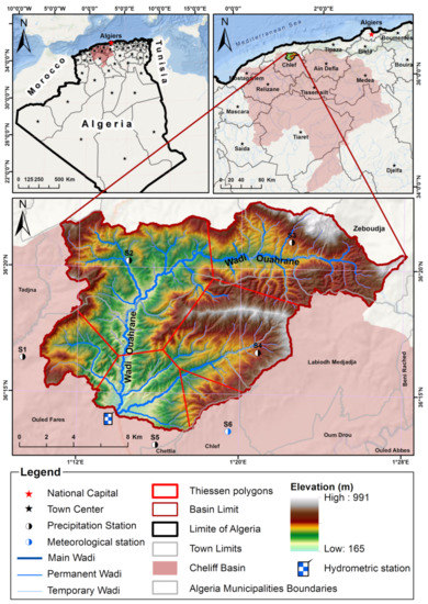 The study area is the Wadi Ouahrane basin of northern Algeria, which is located between 36°00′ N and 36°24′ N and between 01°00′ E and 01°30′ E. It is a small tributary of Wadi Cheliff, extending over 270 km2 with a maximum altitude of 991 m and a minimum altitude of 165 m (Figure 1). The Wadi Ouahrane basin is limited to the east by the basin of Wadi Fodda, to the west by the Wadi Ras basin, to the north by the Wadi Allala basin, and to the south by the Wadi Sly basin. The basin is monitored by six pluviometric stations and one hydrometric station (Figure 1). It is influenced by the Mediterranean climate, with an interannual average precipitation of 333 mm during the period 1972–2018. The mean annual temperature is 18° C. The Ouled Farès sector receives a rainfall that varies from 207 to 628 mm, which is located below 200 m altitude. It occupies nearly 40% of the basin’s area. The Benairia sector, located at more than 350 m altitude, receives an average annual rainfall that varies between 234 and 749 mm. This sector covers about 60% of the basin. The Wadi Ouahrane basin is defined by impermeable marl bedrock that covers 80% of the basin’s surface. In contrast to the formations in the southern part of the basin, which are composed of conglomerate and red sand and have an average permeability, these soft lithological strata in the northern half of the basin are continually subjected to significant water erosion. The primary agricultural activities in the wadi Ouahrane watershed, in terms of land usage, are mixed farming and cereal cultivation [30]. The Köppen–Geiger classification [31] identifies the climate of the basin as a hot-summer Mediterranean climate, thus presenting relatively mild winters (with rain) and very hot summers (often very dry). With this climate, the coldest month generally averages above 0 °C, at least 1 month’s average temperature reaches values higher than 22 °C, and at least 4 months average above 10 °C. Concerning rainfall, in the hot-summer Mediterranean climate, rainfall in the wettest month of winter averages over three times that in the driest month of summer, which receives less than 30 mm.