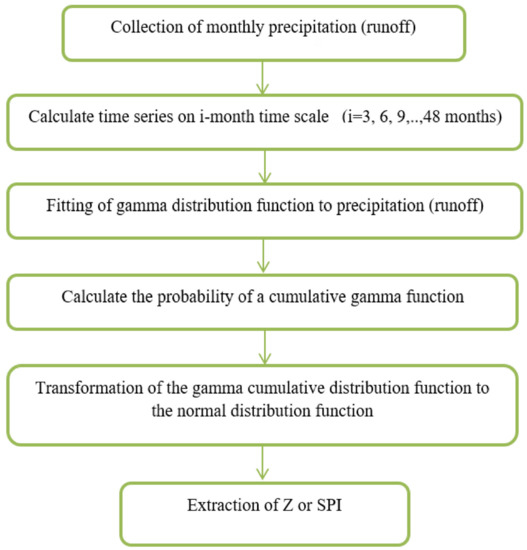 As mentioned above, to study meteorological drought, several indicators have been developed, of which the standardized precipitation index (SPI), first developed by McKee et al. [8], is particularly widely used. For hydrological drought, an index similar to the SPI can be developed as the standardized runoff index (SRI), which is based on monthly mean streamflow and was first proposed by Shukla and Wood [16]. The computational principles of these indices are presented in Figure 2. To forecast the SPI and SRI indices, the commonly known ARIMA model was used [25]. All steps of stochastic modeling were performed in R software in version 4.1.2.