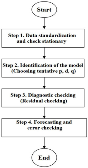 The development of time series models includes three stages: identification, parameter estimation, and a model adequacy test [17]. In the identification step, the general form of the model is determined according to the time series behavior. In the parameter estimation stage, the parameters of the model selected in the previous stage are calculated by a statistical method such as the momentum method or least squares and maximum likelihood. Finally, in the model adequacy test stage or diagnostic check, the selected model is used to model the time series and criteria such as the normality test and the independence of the residual are measured.