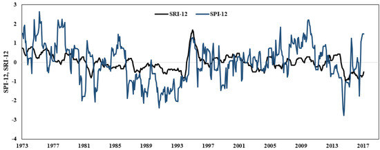In this study, SPI and SRI time series on a 12-month time scale were calculated using monthly precipitation and runoff data over a 45-year period (1973–2017). A 12-month duration of drought is one of the most common among other time scales in the studied watershed [40,41]. Moreover, in larger catchments, there is a strong relationship between meteorological and hydrological droughts if analyses are conducted for a more extended accumulation period [42,43].