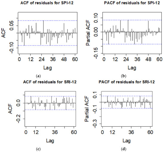Figure 5 shows the ACF and PACF correlograms of the SPI-12 and SRI-12 time series. Owing to the ACF fluctuations in SPI-12 (Figure 5a), the time series is a combination of exponential and sinusoidal damping waves, and lagged correlations are significant in the first 20 time steps. Therefore, an MA model can be proposed. In the case of its PACF (Figure 5b), it is significant in the first step, which can suggest an AR model. In addition, the PACF is significant at 12 and 24 months, so the series has a 12-month period indicative of an annual cycle in precipitation. Therefore, a combination of AR and MA models as a multiplicative SARIMA model is proposed for modeling this series. The same applies to the SRI-12. ACF (Figure 5c) is attenuated as a combination of exponential and sinusoidal waves, and in the first 10 time steps, it is significant that an MA model with different orders can be proposed, and PACF (Figure 5d) in steps 1, 2, and 3 means that an AR model can be proposed with degrees 0, 1, 2, and 3. It also has a periodicity of 12 and 24, which indicates that the model is seasonal. Therefore, this variable is also a multiple (seasonal) ARIMA model.