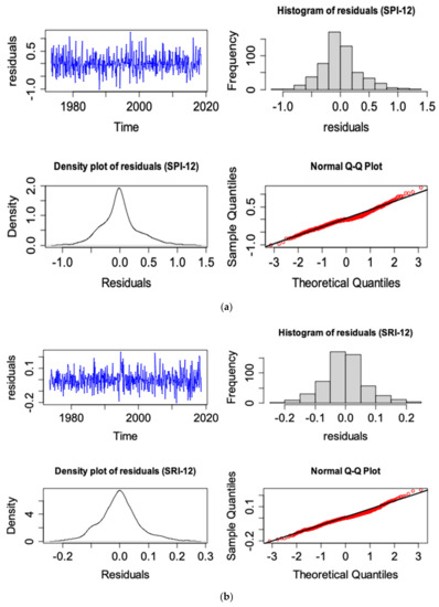 Normal probability plot and residual histogram for SPI-12 (a) and SRI-12 (b).