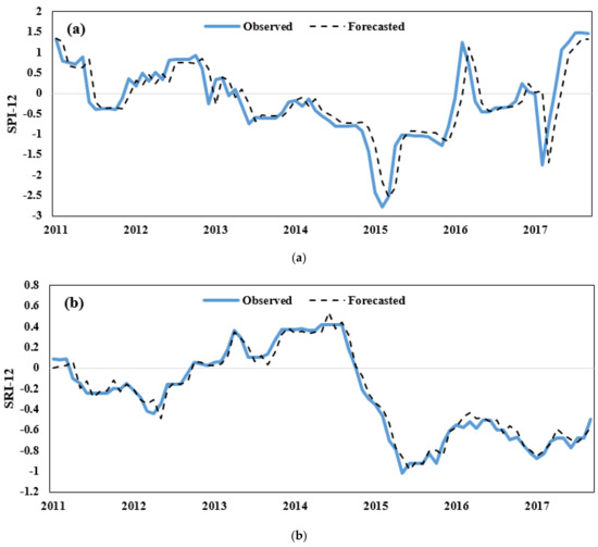 For validation, the time series from 2011 to 2017 was used for SPI-12 and SRI-12. In Figure 8a,b, comparison of the observed and predicted time series shows the two drought indicators. As the results show, there is good agreement between the two series. That is, the time series model was able to simulate drought indices well.