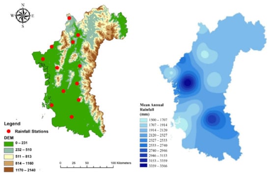 - Suhaila, J.; Jemain, A.A. Spatial analysis of daily rainfall intensity and concentration index in Peninsular Malaysia. Theor. Appl. Climatol. 2012, 108, 235–245. [Google Scholar] [CrossRef]