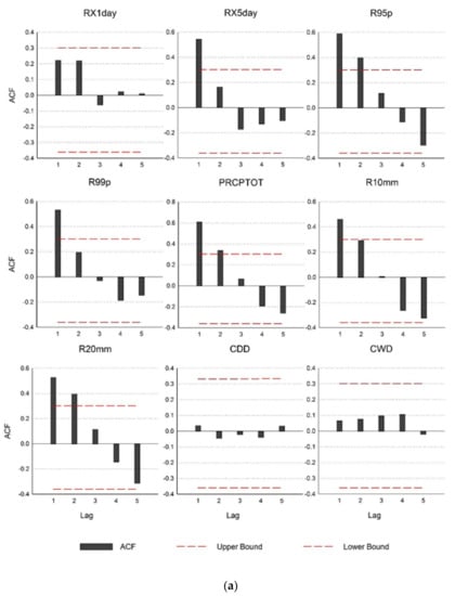 - Test the again for the detrended time series; if the value of the does not reflect a serial correlation, then the MK test can be applied to the original time series data set. Contrary to this, if the shows the correlation, pre-whiten the de-trended series using Equation (5):where shows the pre-whitened time series.