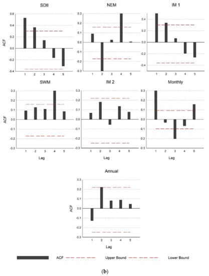 (a) Autocorrelation Function (ACF) analysis of rainfall indices. The red-dotted lines depict the 0.05 significance level and the x-axis shows the lag in the time series. (b) Autocorrelation Function (ACF) analysis of rainfall. The red dotted lines depict the 0.05 significance level, and the x-axis shows the lag in the time series.