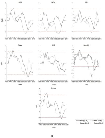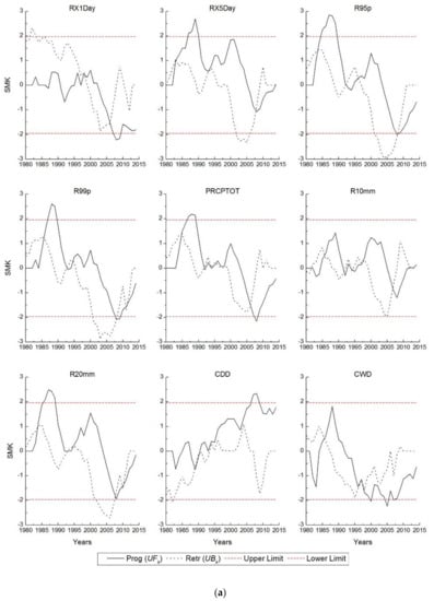 The application of the MK test provides the overall positive (negative) trends; however, in order to identify the abrupt changes in rainfall indices, the sequential Mann–Kendall (SMK) test was applied.