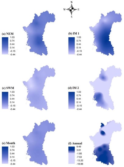 Figure 5 presents the results of the spatial distribution of long-term monthly, seasonal, and annual rainfall over the state from 1980 to 2014. In the case of NEM, the western areas have observed the declination in rainfall with the rate of 0.19 mm/year, while the southeastern areas have experienced an increase in monsoonal rainfall at the rate of 0.56 mm (Figure 5a). The same phenomenon was noted for the IM 1 with the increase in rainfall 1.03 mm (Figure 5b). However, in the case of SWM and IM 2, a decreased rainfall trend was discovered over the entire state. The rate of decrease was higher for the western regions (i.e., 0.45 mm) as compared to the southern regions (i.e., 0.12 mm) for SWM (Figure 5c). Whereas, for IM 2, the rate of decrease was more (i.e., 2.12 mm) from the western regions (Figure 5d). The spatial variability of monthly rainfall has also portrayed the decreased rainfall for the western regions and increased for the southeastern regions (Figure 5e). On an annual basis, again, the trends were similar, and the rate of decrease in annual rainfall was 19 mm for the western regions. On the other hand, the southern regions that are happened to be situated on flat grounds have experienced an increase in rainfall at the rate of 10 mm (Figure 5f).