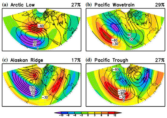 Pacific cluster patterns from Amini and Straus (2019) of the combined 500 hPa geopotential height and 250 hPa zonal wind anomalies resulting in four patterns. Anomalies of Z500 are given in contours (interval 30 m) and U250 are given in shading (units ms−1). The four patterns are defined as (a) Arctic Low, (b) Pacific Wave-Train, (c) Alaskan Ridge, and (d) Pacific Trough. The numbers in the upper right corner give the relative frequency of occurrence. The figure is from Amini and Straus [12] and is used with permission.
