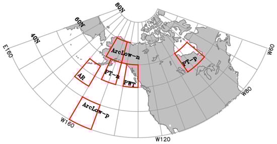 Action centers (outlined by red boxes) at 500 hPa, based on previous studies. Four action centers are chosen in the current study (from left to right): Alaskan Ridge (AR), Pacific High/Arctic Low (ArcLow-n and ArcLow-p), Pacific Trough (PT-n and PT-p), and North American Ridge/Pacific Wave-Train (PWT). In the analysis, ArcLow-n and PT-n were used; –n indicates low-height action centers, and –p indicates high-height action centers.