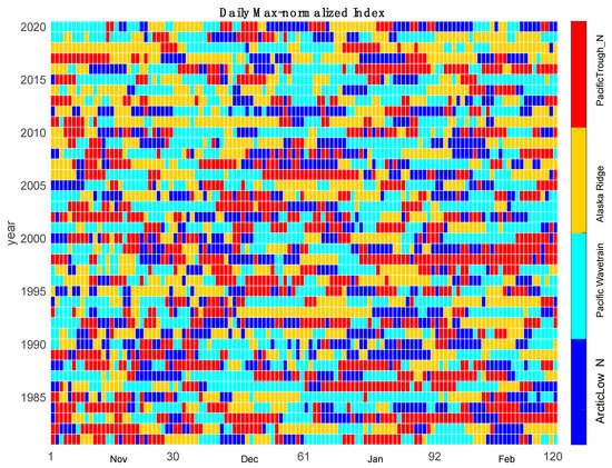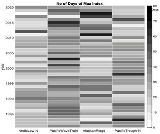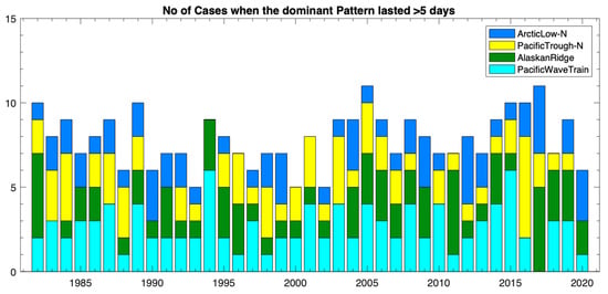 Figure 4 shows the frequency of each pattern being dominant for individual years. Some patterns reoccur in individual years, such as the Alaskan Ridge in 1982, 1991, 1993–1997, 2011, 2017–2018. The Arctic low/Pacific High, as expected, has a lower frequency relative to the other patterns in almost all years, as it is more of a summer rather than a winter pattern. The two blocking patterns, a combination of the Alaskan Ridge and North American Ridge/Pacific Wave-Train, are dominant in the recent decade, 2011–2019, with the exception of 2012 and 2016. The Pacific Trough is dominant in some years: 1983, 1998, and 2016. Possible reasons for interannual variations have been tied to climate indices, such as the PNA, equatorial, and Arctic changes [5,19,20].