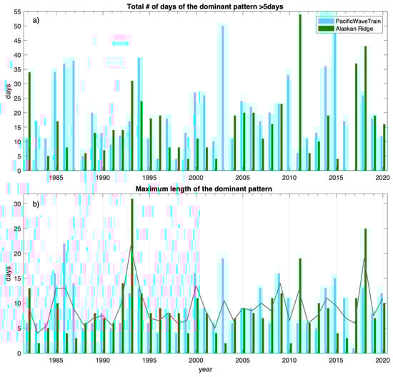The blocking/ridge patterns (the Alaskan Ridge and Wave-Train, Figure 6a) together have an average of 4.8 combined yearly events in the 40-year period (1981–2010), which implies more north–south latitudinal amplitude to the jet stream, while there is a shift in the longitudinal axis for ridging location. There is ridging that is dominant in 1982, 1994, 2005, 2010, 2014, and 2015. There are several years when each one dominates the season with over 35 days of coverage, such as the years of 1986, 1987, 1994, 2003, 2011, 2015, and 2018. The duration of the longest event for the two blocking patterns, the Alaskan Ridge and Pacific Wave-Train, for each year, are provided in Figure 6b. The mean duration for the Alaskan Ridge and the Wave-Train is 8.4 and 9.2 days, respectively. Based on Figure 5 and Figure 6, either the Alaskan Ridge or the Wave-Train tends to dominate the North Pacific in any given year. The few events longer than 10 days approach a sub-seasonal duration.