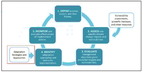 Adaptation menus provide lists of non-prescriptive, dynamic choices to natural resource managers facing complex climate challenges. Rather than guidelines or recommendations, these choices are presented in a menu format to provide a wide range of possible options that can fit users’ circumstances. Selections will necessarily be different depending on vulnerabilities, assets, values, risk tolerance, and other factors [46]. Additionally, menus can be viewed as dynamic, long-term resources that can be revisited and improved over time. Menus have been created through multiple initiatives and various approaches to serve specific disciplinary, regional, and community-based interests [55,56,57,58,59,60].