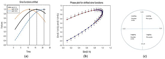 We use a relatively novel technique for calculating Lead–lag (LL) relationships between cyclic time series [9]. The method relates to a dual representation of the time series, x(t) and y(t), first as series depicted as a function of time and second as depicted in a phase plot with one series on the x-axis and the other series on the y-axis. Time in the phase plot is then shown as the trajectories between points. For a quick intuitive illustration, see: https://en.wikipedia.org/wiki/Lissajous_curve#/media/File:Lissajous_phase.svg (accessed on 15 February 2022).