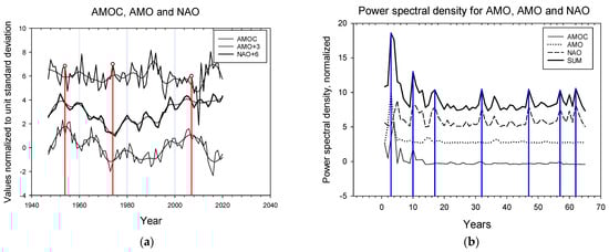Variations of the North Atlantic climate have been shown at interannual and multidecadal time scales, e.g., Wang et al. (2015) [12], Yashayaev et al. (2016) [4], among many others. An emerging picture is that the observed variations are not due to single processes but several processes, and each process has a distinct mechanism and time scale [13]. Figure 2a shows the AMOC, AMO and NAO in raw format and LOESS(0.3)-smoothed. Figure 2b shows power spectral density graphs for the three series. The raw PSD graphs have been normalized to unit standard deviation. The droplines show the most pronounced peaks in the graphs.