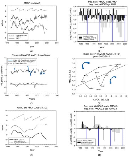 AMOC versus AMO. The two time series are shown in Figure 3a. The upper zigzag curve indicates the length of cycle periods defined by the cumulative angle method. Cycle periods range from 1 to 13 years with an average of 5.6 years. The LL relation between AMOC and AMO shows that AMO basically leads AMOC, and significantly during the periods 1980–1990 and 2000–2020 (Figure 3b). Phase shifts and the β- coefficients between the two time series are shown in Figure 3c. The β-coefficient is positive 63% of the time.