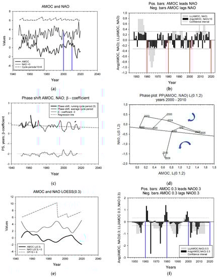 Low-frequency oscillations. The NAO leads AMO. There is one long cycle period of about 44 years, one short period (10 years), and one unfinished period. The lead time is around 9.5 years for the first, long cycle period, but around 7 years on the average. The LL relations for the high-frequency and the low-frequency series are inverse to each other for 20-year periods (Figure 6a, bold lines). The dominant LL relation for the low-frequency series shows that NAO leads AMO pseudosignificantly 66% of the time. The multidecadal variability, and the leading role of NAO to the AMO is also studied by Nigam [16] (p. 5498). They use time series for AMO and NAO similar to ours, and they also LOESS(0.1)-smoothed the series as we did for the high-frequency component in Figure 5d [16]. These authors find that NAO leads the AMO by 16 years. A similar phase shift of ≈−15 years between the positive phases of NAO and AMO were also found by Sun and Li (p. 2, Figure 10, [3]) for their NAO+ and AMO/AMOC+ pair. Both estimates show a longer phase shift than we found. However, both studies estimate the pseudo-cycle period for AMO and NAO to be 50 to 70 years; thus, their phase shifts are ¼ of their cycle period, and in line with our estimate of 0.22 = 9.5/44 for the long cycle period.