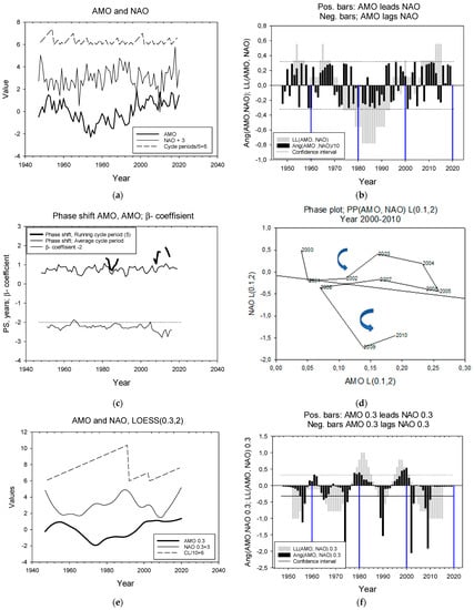 AMO and NAO. The two time series are shown in Figure 5a. Cycle periods range from 1 to 7 years with an average of 2.3 years. The series lead and lag each other for almost equally long periods (Figure 5b and Table 1). Phase shifts and the β-coefficients between the two time series are shown in Figure 5c. A phase plot for a section of the time series from the year 2000 to 2010 shows that in the first part of the series, from 2000 to 2003, the trajectory rotates counterclockwise (+) and AMO leads NAO, then there is a period from 2003 to 2007 when the rotation is counterclockwise (+ positive) and AMO lags NAO. For the last period, from 2007 to 2010, AMO again leads NAO. The LOESS (0.3)-smoothed series are shown in Figure 5e. Cycle periods now range between 10 and 44 years with an average of 23 years.