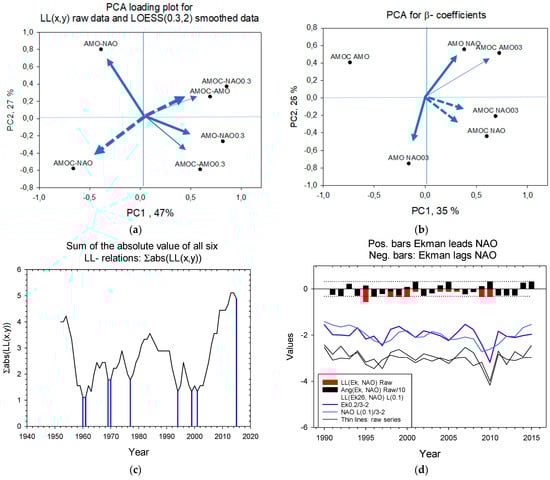 Summary characteristics. (a) Principal component loading plot for LL relations between the three modes, AMOC, AMO, and NAO, their high- and low-frequency series. (b) PCA loading plot for the series β-coefficients (slopes between paired series), their high- and low-frequency components. (c) The stacked sum of the absolute value of the LL (x,y) values. The droplines designate troughs in 1960–1961, 1968–1969, 1977, 1994, and 1999–2001. (d) Ekman time series, raw series (dashed lines) and Ekman 26, LOESS (0.2)-smoothed, and NAO LOESS(0.1)-smoothed (Full lines). The red bars show LL relations based on the raw data, and the light blue bars show LL relations based on LOESS-smoothed series.