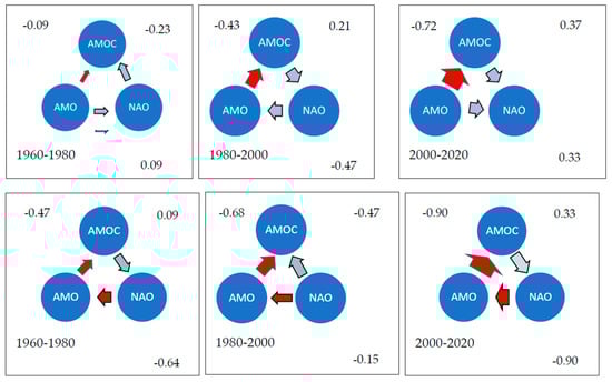 LL relations between the AMOC, the AMO, and the NAO: LL(AMOC, AMO), LL(AMOC, NAO), LL(AMO, NAO). AMOC is measured in Sverdrup, Sv; AMO is measured in temperature degrees; and NAO is measured in sea-level pressure, hPa. We have distinguished three periods corresponding to the LL patterns in Figure 2. The arrows indicate leading directions, and arrow thickness indicates leading strength, Equation (2). The numbers in each corner show numerical values for direction (LL(x, y) > 0: x→y. The leading strength is the average for the ten mid-years in each period. Upper row: high-frequency oscillations. Lower row: low-frequency oscillations. Red arrows suggest that the leading role is persistent across all time periods.