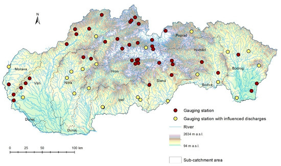 We selected 42 representative water-gauging stations (WSs) in Slovakia with a period of observation since at least 1961 and with little or no anthropogenic influence on discharges. For a more even coverage of the territory of Slovakia, we also added 21 stations with the hydrological regime partially influenced by human activities for evaluation because, especially in lowland areas, the regime at most WSs has been influenced by abstractions for agriculture and industry as well as by manipulations on water reservoirs. The results from these WSs were considered with respect to this fact and were not directly used to generalize the results. The spatial distribution of the selected WSs is presented in Figure 1 and the catchment characteristics are summarized in Table 1.