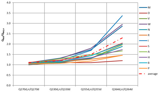 As a first step, the values of the FDCs were computed for both methods for the 1961–2000 period. The ratios between the M-day discharges in the low-flow area determined using Method 2 and their counterparts obtained using standard Method 1, commonly used in Slovakia (i.e., values Q330d,rr/Q330d to Q364d,rr/Q364d), are significantly higher than 1, as shown in Figure 2. However, the differences vary in the individual sub-catchments as well as at the individual WSs.