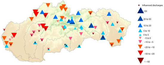 The evaluation of data of selected water-gauging stations in the 2001–2015 period versus the 1961–2000 reference period by the standard method showed a higher number of stations with a decrease in Q330d,2001–2015 compared to Q330d,1961–2000 (Figure 3).