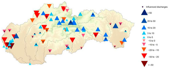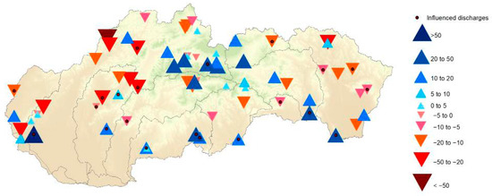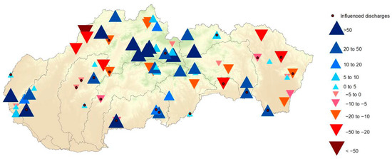 An increase in the values prevail in Q355d,2001–2015 and Q364d,2001–2015 in comparison with the corresponding reference values (Figure 4 and Figure 5), with a more significant increase related to Q364d. The increase for all quantiles is noticeable, especially in the area of the northern parts of central and Eastern Slovakia (upper parts of the Váh, Hornád, and Poprad sub-catchments). The decline is noticeable in the eastern part of Slovakia (Bodrog sub-catchment) and in the southern and western parts of Slovakia. For Q364d, it is obvious that the number of stations with increasing values significantly exceeds the number of stations where the value of Q364d decreased in the evaluated period compared to the reference period (Figure 5).