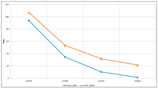 Similarly, the analysis of the longest drought events at WSs (Figure 8) with mean, minimum, and maximum values determined, with the comparison of the results for both types of limits, shows the highest differences for the limits Q364d (Q364d,rr/Q364d = 3.9) and Q355d (Q355d,rr/Q355d = 1.7).