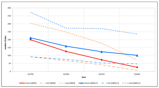 Figure 7. Average number of days with Qd < limit from 1961–2015 (comparison for limits QMd and QMd,rr).