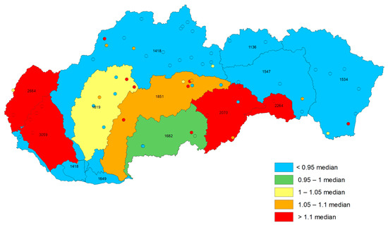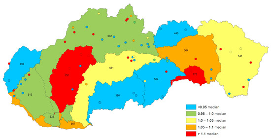 After excluding a few outliers (e.g., a small stream in a Danube sub-catchment, where a little change in the value of Q364d corresponds to a change of several hundred percent), the mean values of the ratio QMd,rr/QMd for the 1961–2000 period were processed for the sub-catchments of Slovakia depicted in Figure 1. For Q364d,rr/Q364d, the highest values were detected in the Ipeľ (3.4), Malý Dunaj (2.9), and Morava (2.9) sub-catchments. The lowest values of Q364d,rr/Q364d occurred in the Danube (Danube River; 1.2), Poprad (1.5), and Hron (1.5) sub-catchments. The average value of the ratios for the whole Slovak territory was 2.0.