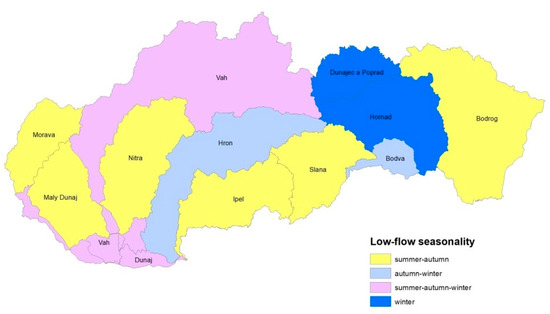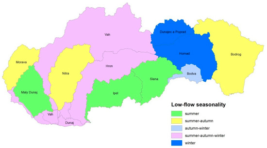 The seasonality of the longest low-flow episodes on Slovak rivers prevails in the summer–autumn period; however, in case of the mountain streams, the low-flow episodes with a longer duration also occur in the winter period, which is associated with the temporary freezing of watercourses and the entrapment of water in the form of snow and ice. For the summer period, the sub-catchments of the rivers Ipeľ, Slaná, and Malý Dunaj were identified as the most drought-prone areas in Slovakia (Q364d).