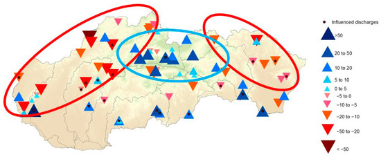 Changes of M-day discharges in the low-flow area in the 2001–2015 period show regional differences. The regions of Slovakia highlighted by the red ellipses in Figure 14 can be considered to be more sensitive. They are characterized by predominant negative changes in the Q355d values at the assessed WSs. These regions cover the western, southwestern, and eastern parts of Slovakia. On the other hand, the middle blue ellipse in Figure 14 representing the upper, mountainous parts of the Váh, Hornád, Hron, Poprad, and Slaná sub-catchments shows positive changes in these values. These findings are in line with the results of previous studies [24,31]. For the threshold Q364d, the increase in the values prevails at the assessed WSs more significantly than for Q355d. We should keep in mind that the results are partially affected by the values from WSs with the anthropogenically influenced hydrological regime, especially in the southern, more lowland regions of Slovakia. The positive changes in some cases (mostly in these southern, downstream areas), to some extent, point to the effects of manipulation on water reservoirs.