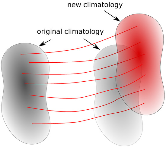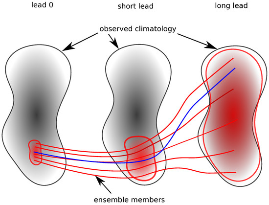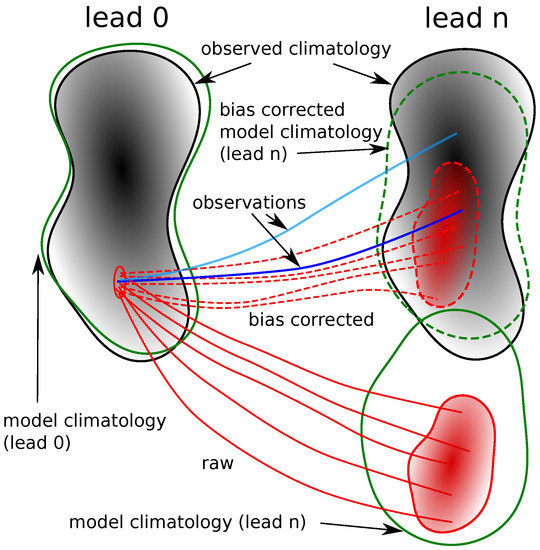 The solid red lines in Figure 1 represent a handful of forecast ensemble members (in practice, there may be hundreds). These members typically spread as lead time increases. At the lead time at which the forecast is assessed (lead n), the members span a broader space of the climatology (than when they started) given by the red shaded area enclosed by the solid red line on the right. This red area, in turn, sits within the climatology of the forecast model for this given lead time, represented by the solid green line. This forecast climatology at lead is not the same as the observed climatology. The differences in these climatologies are related to a combination of model errors and experimental set up [46]. The difference between the model and observed climatology is referred to as ‘model bias’. If the bias is large enough, a ‘bias correction’ is usually performed to map the forecast ensemble back into the climatological space of observations [40,47]. This bias-corrected forecast is represented here by the dashed red lines that transform the ensemble members into the space spanned by the dashed red line around the red shaded region. The forecast climatology at this lead time is now transformed by the bias correction and is represented by the dashed green line. This bias-corrected model climatology will, in general, not be identical to the observed climatology (grey shading) because the bias correction process is imperfect.