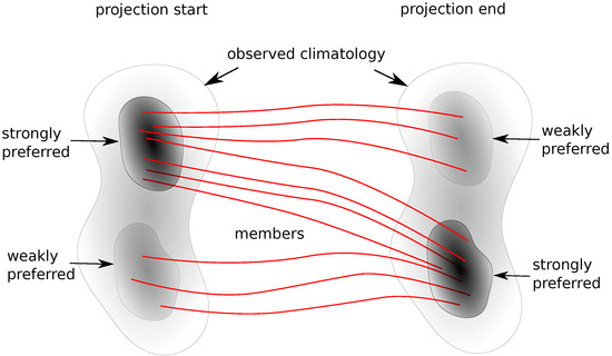 This situation is shown schematically in Figure 3. The climate of the projection variable is given by the broad grey space on the left. Within this space, there is one weakly preferred region in lighter grey and a strongly preferred region in darker grey. The strongly preferred region will typically contain more projection members at any given point in time as they are attracted to this space. A possible response to the applied forcing is a switch such that the weakly preferred region is now strongly preferred, and vice versa. That corresponds to the majority of projection members now sitting in the lower grey space on the right in Figure 3, which is now darker to signify the shift in preference to it. Any projection or forecast that successfully captured this change in preference would maintain skill relative to the original climatology.