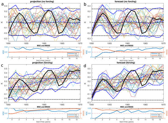 Experiments without and with initial conditions and forcing. The four cases correspond to experiments with (a) no initial conditions and no forcing, (b) initial conditions and no forcing, (c) no initial conditions and forcing, and (d) both initial conditions and forcing. In part (a), top panel, the colored lines show a set of 30 idealised climate projections, nominally starting in 1950. The solid black line is the member taken to represent the ‘observations’. The horizontal dashed black lines represent the 2.5, 50, and 97.5 percentile values of the climatological distribution of ‘observations’ calculated from the long control run of the model. The dashed blue lines are the values of the 2.5 percentile, ensemble mean, and 97.5 percentile from the distribution of 100 projection members, calculated each year to show their variation in time. In part (a), the bottom panel shows the MSE and MSSS skill scores from this experiment as a function of lead time. The skill scores are calculated over the 150 forecasts in each experiment. In part (b), the colored lines are a set of 30 forecast members without forcing. The solid and dashed lines are defined as in part a. In part (c), top panel, the colored lines are a set of 30 projection members with forcing. The observations are represented by the black line, which has the same linear forcing term as the projection members. In part (d), top panel, the colored lines are 30 forecast members with forcing. The same linear forcing has been applied to the forecast members and the observed member (black line).