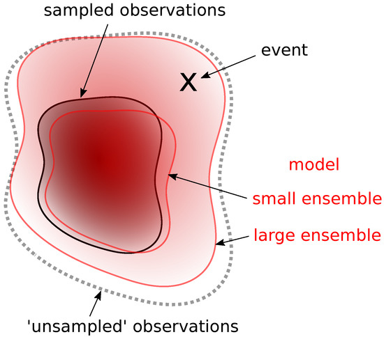 The concept underlying this approach using the model large ensemble is represented schematically in Figure 6. A previously ‘unseen’ [73] event ‘X’ occurs that sits outside the sampled observations’ climatology. Perhaps such events would be observed in a longer sample of observations. However, lacking such observations, we do not know where this event might sit in a better-sampled distribution (represented hypothetically by the unknown region labelled ‘unsampled observations’). With few or no other events of this magnitude, there is little empirical basis to estimate the likelihood of such an event. One way around this is via extreme value theory [77], where one makes assumptions about the shape of the (unobserved) long tail of the observational distribution. The alternate approach considered here uses the large ensemble hindcast data to generate a much larger sample in the model world, represented by the outer shaded red region in Figure 6. The extreme event ‘X’ now lies inside this much broader climatological sample. If the model is deemed to be a sufficiently good representation of the statistics of the observed climate, then the model large ensemble climatology can be used to estimate the likelihood of event ‘X’ occurring, since there are many events of equivalent (or greater) magnitude to ‘X’ in the large ensemble.