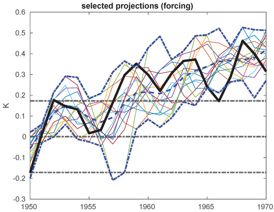Methods have been developed to subsample model projections to more closely mimic forecasts [28,82,83,84]. In a large ensemble of projections, some of the projection members may be more or less in sequence with natural observed variations by chance alone. Such members have about the same initial state as observations, and thus might perform as if they were forecasts. To illustrate the subsampling method, we subsampled the projection members in the projection experiment in Figure 5c, retaining only those members that started close to the observed member and which had the same trend sign as the observed member at that initial time. The subsampled projections are shown in Figure 7. In this case, the ensemble mean of the projection subsample (dashed blue line) now tracks the observations member for half a decade and looks much more like the ensemble mean in the experiment with both forcing and initial conditions (Figure 5d).
