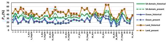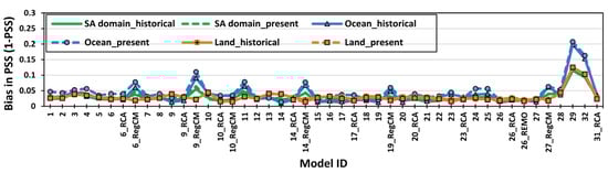 The computed entire domain mean correlation coefficient ranged from 0.68 to 0.9 over the SA domain. All the climate models showed higher over the land compared to ocean in capturing annual cycle variation over the SA domain (Figure 4). The was the same in both study time slices for most climate models over the SA domain. The climate models were sorted in descending order of their skill, based on computed RS, tabulated in Table S3. Over the SA ocean, models 26_REMO (MPI-M-MPI-ESM-LR(REMO2009)), 26 (MPI-ESM-LR) and 27 (MPI-ESM-MR) performed well in both time slices with least . The 26_REMO not only performed well over the ocean but was also the top-performing model over land. Over the SA land, the ensemble of twenty-eight GCMs (MME_CMIP5) had a higher skill in capturing annual cycle variation relative to all individual GCMs. The MMEs showed similar skill in capturing annual cycle patter; however, MME_CORDEX had a slightly higher (4.62% over ocean and 8.68% over land) RS compared to MME_CMIP5 (Figure 4 and Table S3). Models 24 and 25 showed lower skill over both ocean and land. The 27_RegCM showed poor skill in capturing the annual cycle pattern over the SA domain, even though its parent GCM MPI-ESM-MR showed moderate skill. Parent GCMs performed better in capturing annual cycle variation than RegCM type RCMs, except for model 10. This inference agrees with Herrmann et al. [82], who observed that parent GCMs show a higher correlation than RCMs in capturing annual cycle variation over South East Asia.