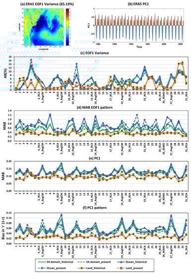 The ability of GCMs and RCMs in reproducing the magnitude and pattern of EOF1 and PC1 is discussed in this section. The ACS summary of each GCM and RCM is shown in Figure 3c–f, and estimated RS is tabulated in Table S2. The climate models’ ACS was almost same in both time slices, and it was lesser over SA land compared to the ocean. The ERA5 historical monthly mean WS EOF1 accounted for 67.71%, 56.14% and 65.19% of the total variance over the ocean, land and entire SA domain, respectively. The maximum WS variability was observed along the flow of Somali Jet (Figure 3a). Most of the climate models had AB below 8% in representing the percentage of variation, whereas model 5 had a maximum of 16.43% AB over SA ocean in the present time slice. Overall, the GCMs 15 and 17 (26_REMO) showed higher skill in capturing the spatio-temporal variability of monthly mean WS over the SA ocean and SA land relative to all individual GCMs (RCMs) (Table S2). All the parent GCMs outperformed RCMs over the ocean region of the SA domain, whereas over the land region of the SA domain, RCMs (excluding RCMs driven by 14, 19 and 20) showed higher skill relative to parent GCM. When the MMEs of CMIP5 and CORDEX were compared over the SA domain, the MME_CMIP5 skill was found to be greater (11.66 % over ocean and 5.83 % over land) than MME_CORDEX (Table S2). Even though MMEs showed poor skill in estimating the EOF1 variance (AB > 8.5% over ocean and AB > 14% over land), both MMEs showed greater skill in reproducing the EOF1 pattern, PC1 pattern and PC1 magnitude compared to most individual climate models (Figure 3c–f). All climate models showed higher skill over land relative to ocean because of less variability of the monthly mean WS over land.