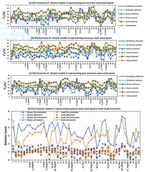 (a) Represents the Assessment Criterion Statistic (ACS) summary of climate models in simulating pre-monsoon (February–May) mean wind speed over South Asian (SA) domain for historical period (1979–2005) (green solid line), over SA domain for present period (2006–2019) (green dashed line), over ocean for historical period (blue solid line with triangle markers), over ocean for present period (blue dashed line with circle markers), over land for the historical period (orange solid line with plus sign markers) and over land for present period (orange dash line with square markers); percentage of statistically significant bias (, %) on y-axis and Model ID on x-axis. (b) As in (a), but for monsoon season (June–September). (c) As in (a), but for post-monsoon season (October–January). (d) Relative Score (RS) (summation of relative score over both time slices) of each climate model in simulating seasonal mean wind speed, over ocean (blue solid line) for pre-monsoon (circle markers), monsoon (triangle markers), post-monsoon (diamond markers) and for all three seasons (thick solid blue line with cross sign markers), and over land (orange dashed line) for pre-monsoon (filled square markers), monsoon (plus sign square markers), post-monsoon (cross sign square markers) and for all three seasons (thick solid orange line with square markers).