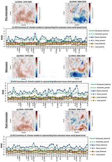 The ERA5 pre-monsoon mean wind speed trend maps with stippling for (a) historical (1979–2005) and (b) present time slice (2006–2019), where the stippled grid cells indicate the location where trend is statistically significant (p < 0.1). (c) As in Figure 2, but this figure represents mean absolute bias (MAB, cm/s/yr) of climate models in reproducing the ERA5 pre-monsoon mean wind speed trend; MAB on y-axis and Model ID on x-axis. (d–f) As in (a–c), but for monsoon season. (g–i) As in (a–c), but for post-monsoon season.