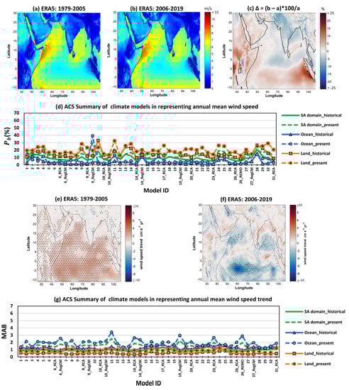 Over the ocean, most of the climate models showed less (close to zero) in representing annual mean WS climate (Figure 7) and more (on average 8.7 times in the historical period) in representing seasonal mean WS (Figure 5). The 27-years annual mean WS was the same as the mean of all daily WS due to bias correction with the quantile mapping technique. This technique ensured that all the statistical properties of the model matched well with reference data over the considered time slice. However, the statistical properties of models and the reference dataset might not match well over the intermediate time slice, which led to higher bias over the seasonal scale. As a result, the climate models’ skill was evaluated as a seasonal scale considering the weighting factor as one, and zero for the annual mean WS climate assessment. Increasing annual mean WS was observed over most parts of the SA ocean in the historical time slice, whereas the decreasing trend was observed in the present time slice (Figure 7e,f). The decreasing trend of 1–2 cm/s/yr was observed along the central east and west coast of India, and the same was reported by Shanas and Kumar [87]. Most of the models showed a similar skill in reproducing the observed annual mean WS trend, whereas model 11 showed poor skill with higher MAB over the SA ocean (Figure 7g). A statistically significant increasing trend was observed over most parts of the SA ocean in the historical time slice, whilst the significant decreasing trend was observed in the present time slice in all seasonal and annual scales (Figure 6 and Figure 7). All of the models failed to reflect this shift in trend pattern and magnitude, resulting in a larger MAB in the present time slice. The estimated RS of each climate model in capturing the annual mean WS trend is tabulated in Table S9.