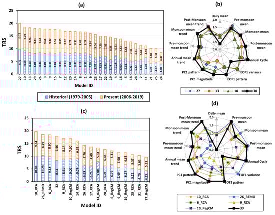Summary of climate model’s skill over ocean part of South Asian domain for the historical and present time slice. (a) Computed Total Relative Score (TRS) of CMIP5 GCMs. (b) Relative Score of best-performing CMIP5 GCMs for different climate variable scales. (c) As in (a), but for CORDEX RCMs. (d) As in (b), but for CORDEX RCMs.