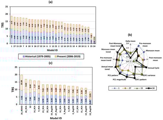 Summary of climate model’s skill over land part of South Asian domain for the historical and present time slice. (a) Computed Total Relative Score (TRS) of CMIP5 GCMs. (b) Relative Score of best-performing CMIP5 GCMs for different climate variable scales. (c) As in (a), but for CORDEX RCMs.