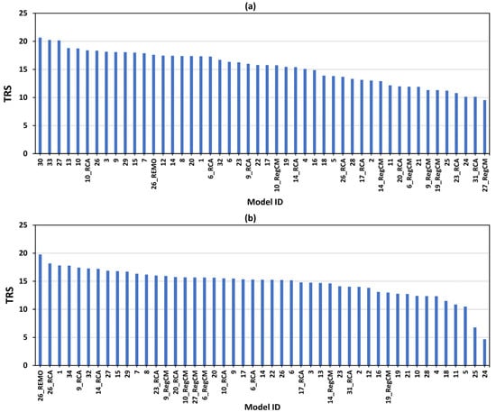The estimated Total Relative Score (TRS) of all climate models along with best-performing models over (a) ocean, and (b) land of South Asian domain.