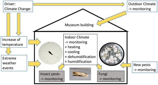 Querner, P.; Sterflinger, K.; Derksen, K.; Leissner, J.; Landsberger, B.; Hammer, A.; Brimblecombe, P. Climate Change and Its Effects on Indoor Pests (Insect and Fungi) in Museums. Climate 2022, 10, 103. https://doi.org/10.3390/cli10070103